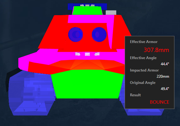 Commander’s hatch has around 150 mm of effective armor, while the lower plate has around 175 mm. Just like the tier 9, the tier 8 also has some weird weakspots in form of richochets that go into your hull and have a 100% of penetrating your armor.